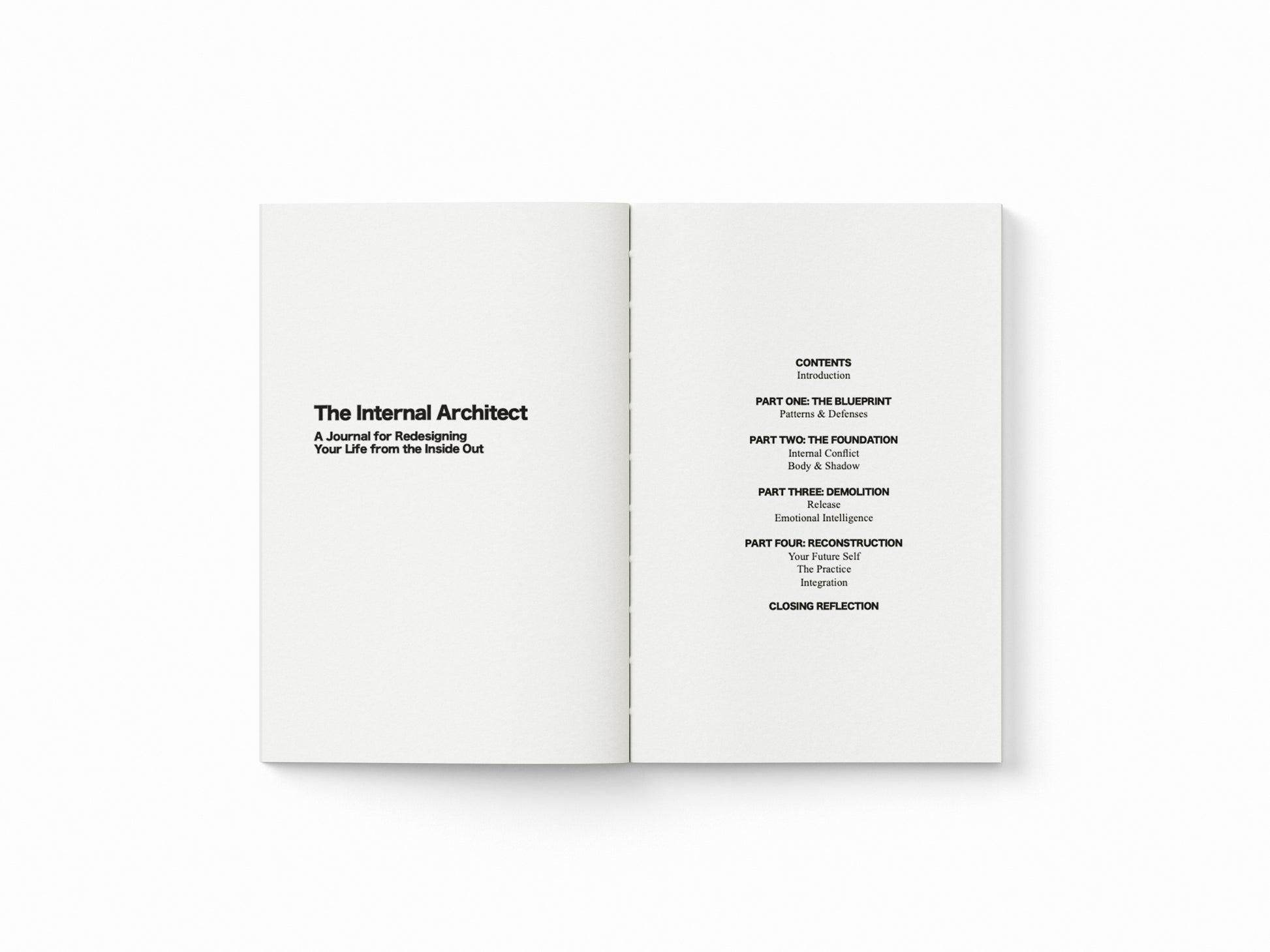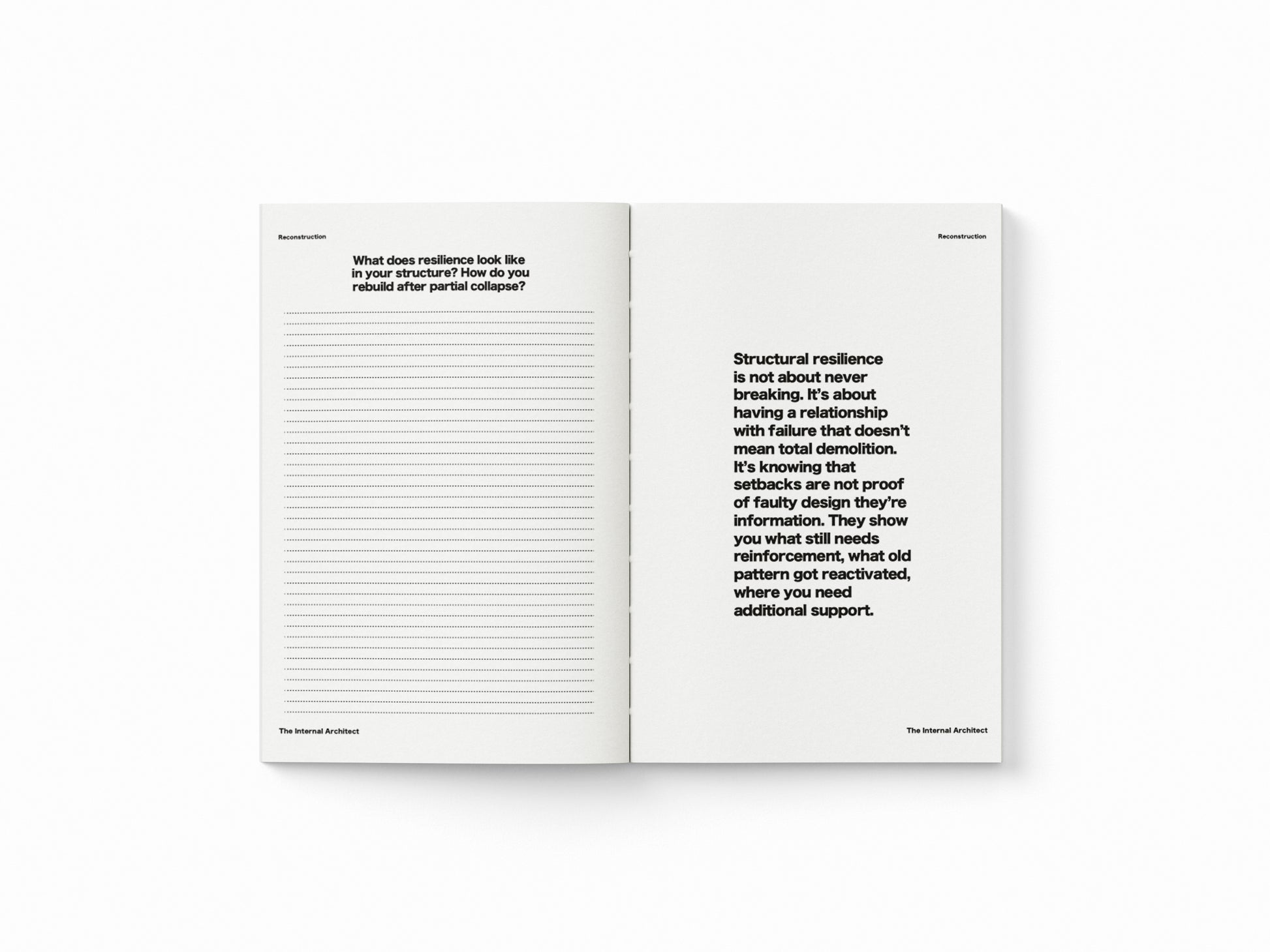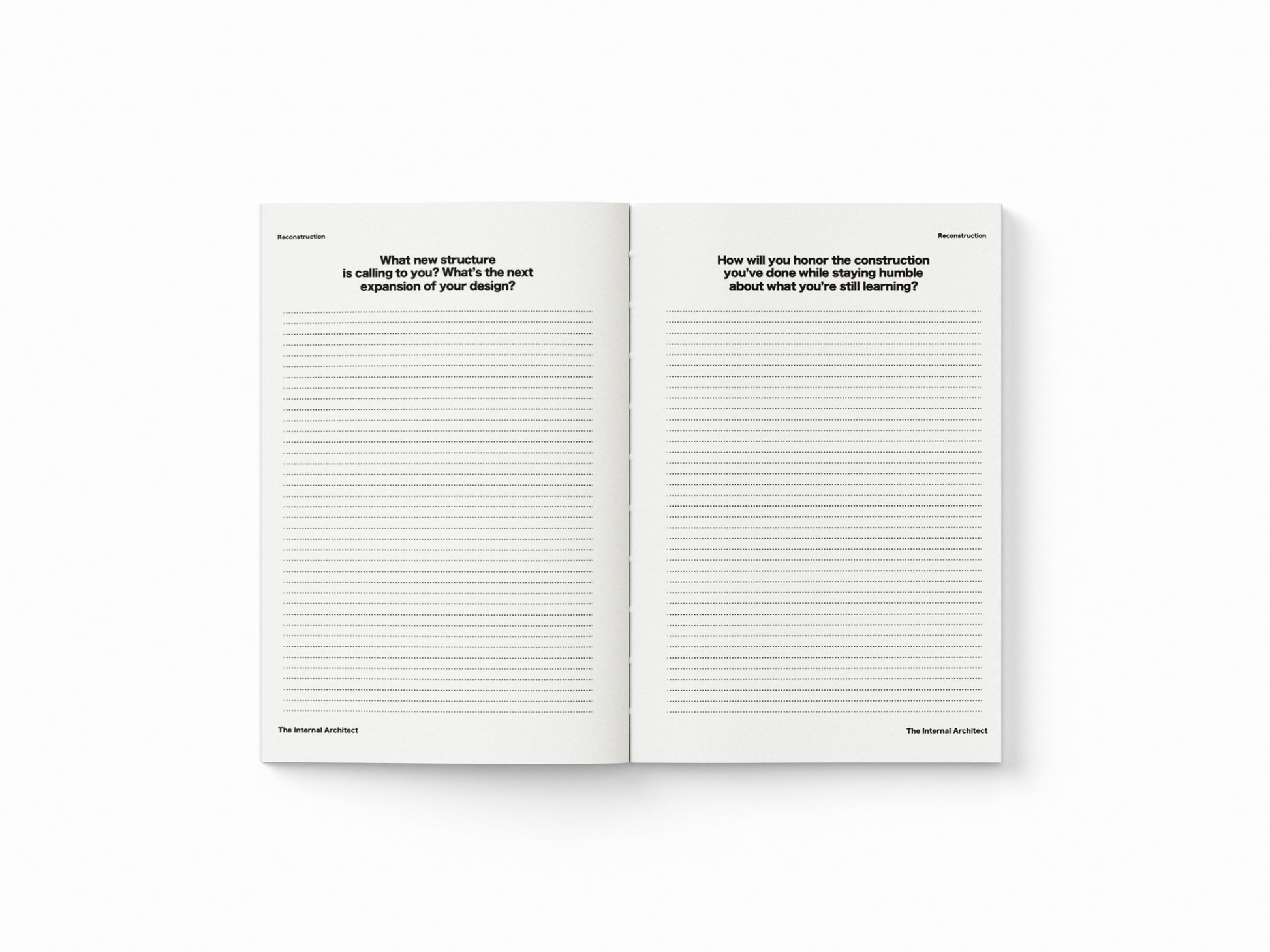 A5 softcover journal with guided prompts for deep inner work. For excavating foundations, reinforcing what's load-bearing, and demolishing what keeps you confined.